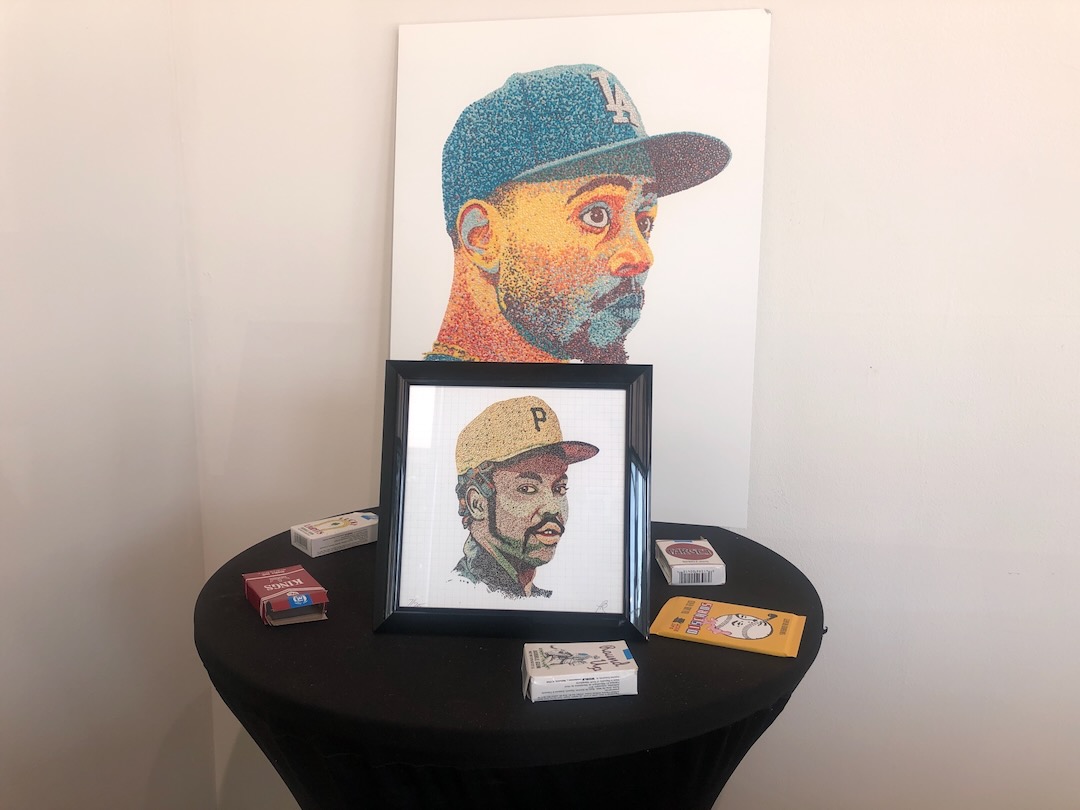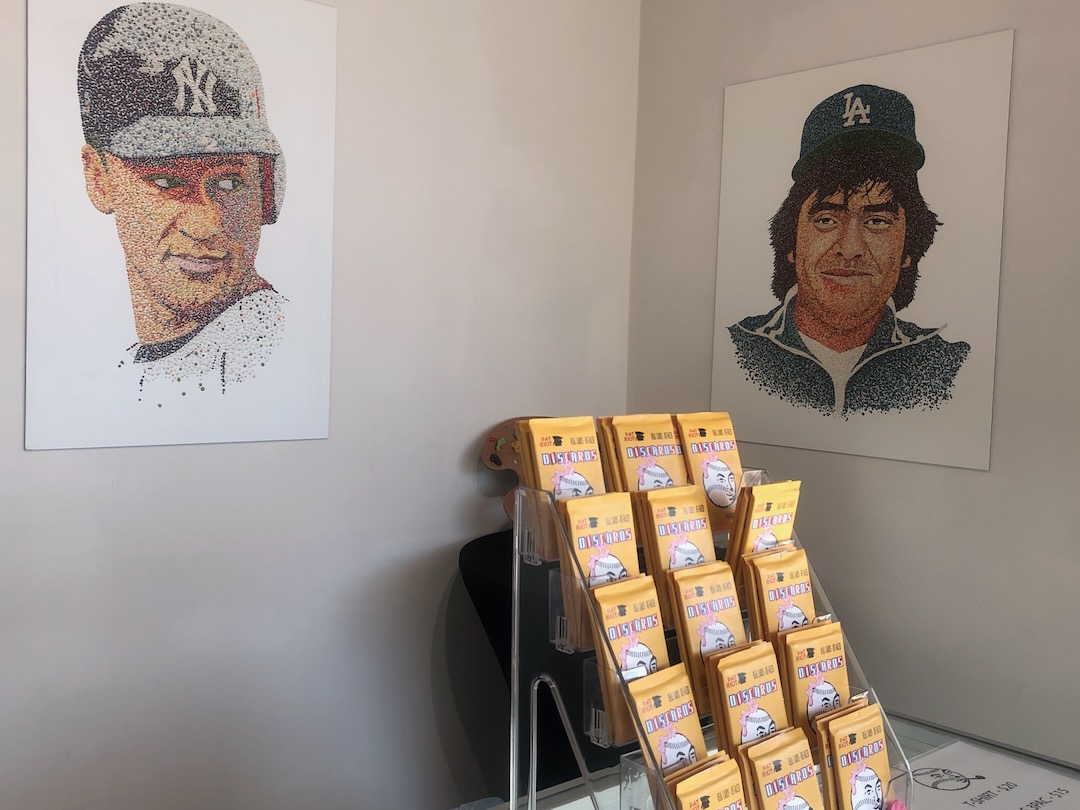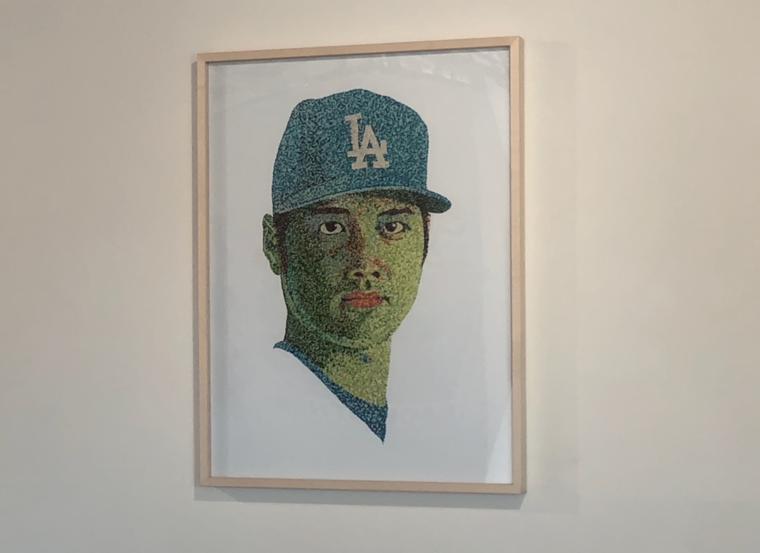 Pat Riot’s contributions to Doubleday center around his bubblegum series, where he uses chewed gum and aluminum panels to create portraits of baseball players. It’s a concept that references the sticks of gum that comes with packs of baseball cards made with a technique that is derived from pointillism. Fernando Valenzuela appears in the center of a large wall near the back of the gallery, with Shohei Ohtani and Mookie Betts’ portraits on either side. Nearby, is Freddie Freeman.