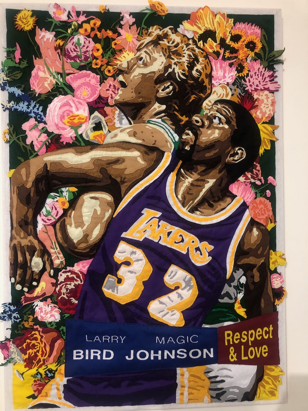 Also, the felt adds a softness to the hyper-masculinity of sports, which might be the point, given that the athletic images in the foreground are juxtaposed with roses in the background. Plus, the subject matter play with and often challenge male stereotypes. In Bird & Magic, Larry Bird and Magic Johnson, famed ‘80s basketball rivals who were said to be friends off court, appear alongside the phrase “Respect & Love.” In Decoy Ohtani, Shohei is seen not mid-pitch or swing, but holding his dog Decoy.