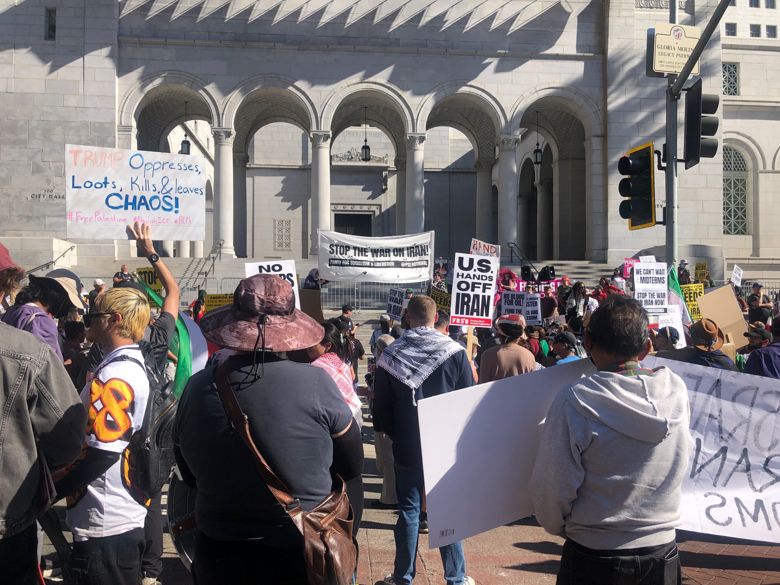 As the Santa Ana winds whipped through Los Angeles, downtown protestors clung to signs that read, “Invest in peace not the Pentagon” and “War crimes don’t hide sex crimes.” A string of activists spoke on the steps of City Hall. They led us in a run of chants all of which could be summarized in one point: end the wars.