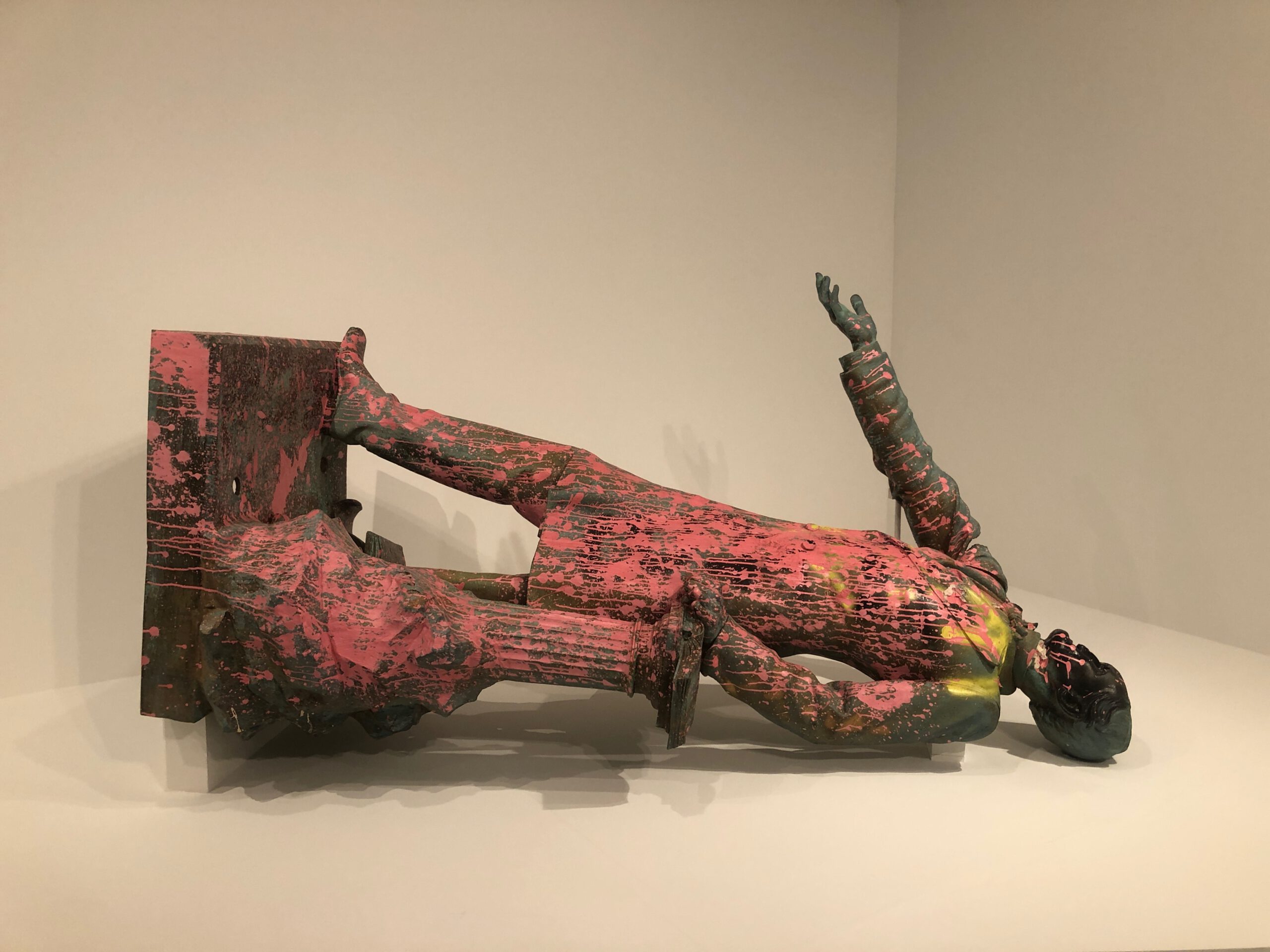 Jefferson Davis looks like he’s been clocked. The oversized, bronze statue of the onetime president of the Confederacy is laid out on the floor of the Geffen Contemporary at MOCA. He’s splotched and tagged with paint, dried pink streams running down the length of the statue like blood. Walk up close and you’ll see that the top of his head has been pounded flat. An outstretched arm, partially severed from the shoulder, may have once given him the appearance of a savior. Now, it looks like he the one who needs saving. I study the hulking figure for a few moments, snap a couple photos and continue through the museum. Some monuments are better left down for the count.