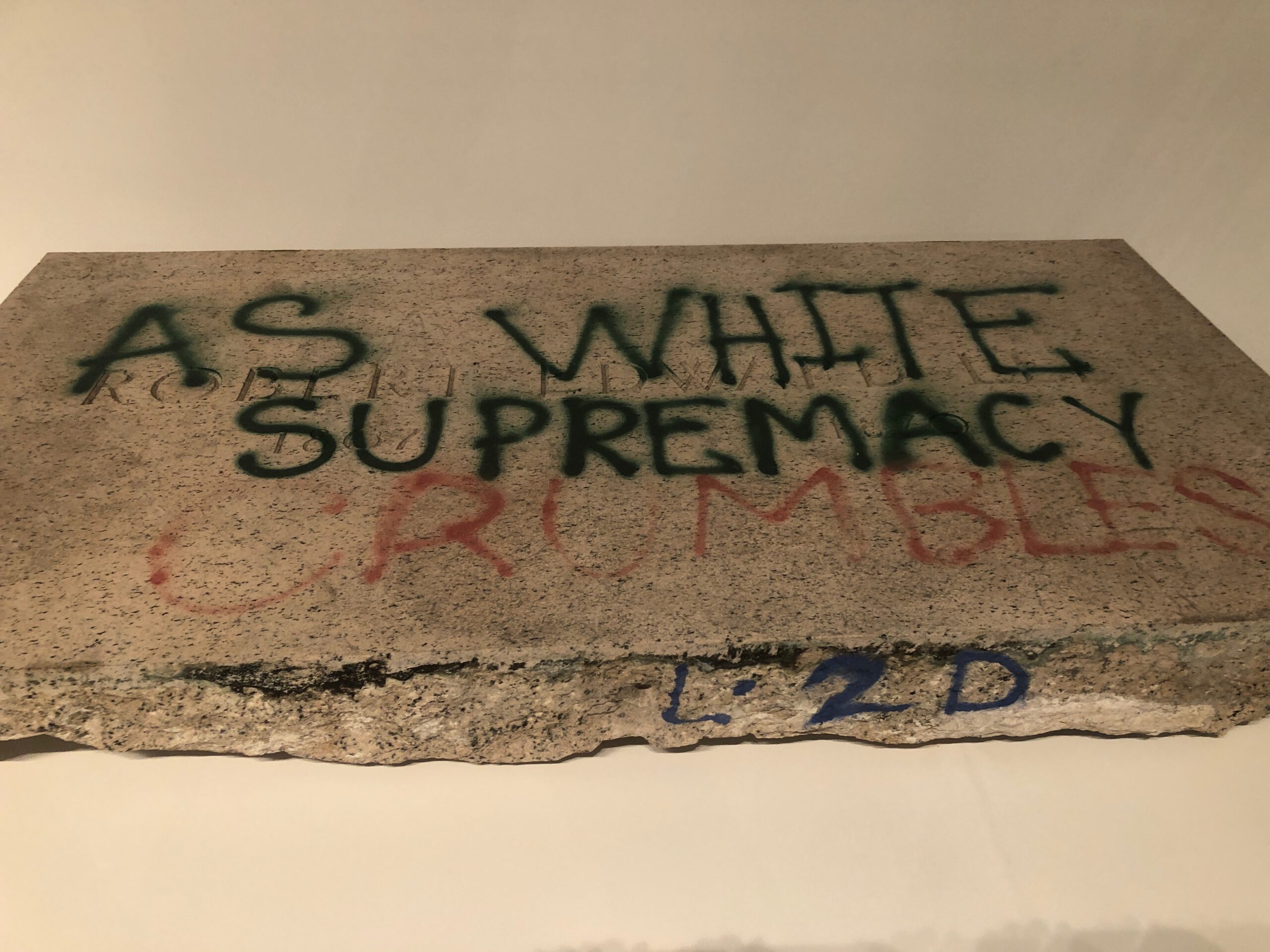 Monuments, a collaboration between MOCA and The Brick that’s on view at the Geffen Contemporary through May 3, is an exhibition juxtaposing decommissioned monuments with contemporary art to explore U.S. post-Civil War history. The Jefferson Davis statue, which was dedicated in 1907, lived in Richmond, Virginia, where it was part of a whole complex of Confederate monuments. In 2018, a local commission in Richmond recommended its removal, but that didn’t happen until two years later, when the statue was paintbombed and toppled during protests following the murder of George Floyd.