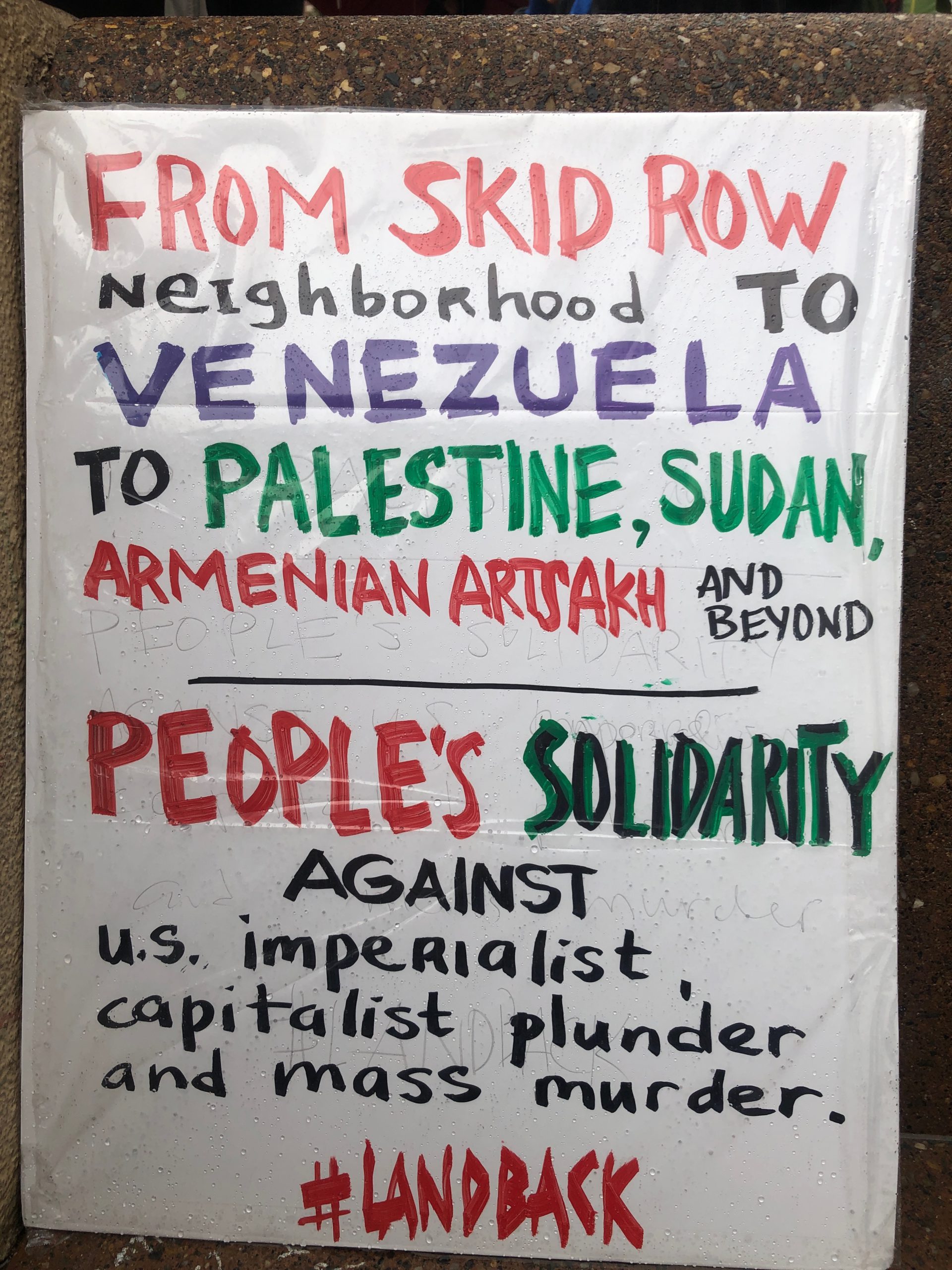 Someone asked me if I wanted to hold a sign. I said sure and clasped the stake, hoisting a plastic-covered sign that read “U.S. Out of the Caribbean” into the air, where it stood alongside my umbrella. The chants began and the rain dropped harder as more people crowded into a small corner of Pershing Square.